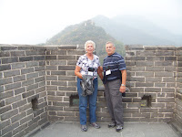 After lunch we again boarded the bus for a ride to “The Great Wall” - one of the items on Judy’s bucket list. She had dreamed of walking on the wall for a long time and finally the opportunity was here. The wall is really a series of inter connected walls constructed as military barriers and built over a number of years. Along the wall are outposts for observation and defensive fighting. Several of these outpost buildings had central fireplaces. This section is northeast of the center of Beijing in the start of the mountains. When we arrived we had our choice of two sections to climb. The one to the left was very steep but shorter or the less steep but longer one to the right. .